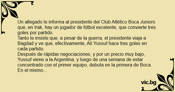 Un allegado le informa al presidente del Club Atlético Boca Juniors que, en Irak, hay un jugador de fútbol excelente, que convierte tres goles por partido.