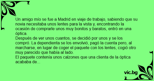 Un amigo mío se fue a Madrid en viaje de trabajo, sabiendo que su novia necesitaba unos lentes para la vista y, encontrando la ocasión de comprarle unos muy bonitos y baratos, entró en una óptica.