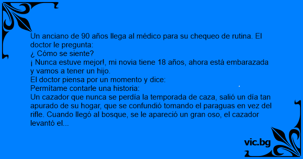 Egy 85 éves bácsi dicsekszik az orvosának, hogy fiatal felesége terhes lett. Mire az orvos: - Hadd meséljek el magának egy történetet! Egy ember elment vadászni, de olyan szórakozott volt, hogy...