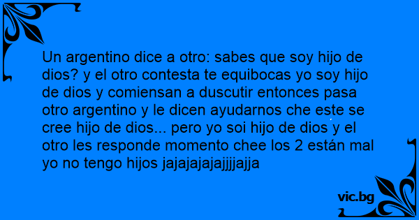 Un argentino dice a otro: sabes que soy hijo de dios? y el otro contesta te equibocas yo soy hijo de dios y comiensan a duscutir entonces pasa otro argentino y le dicen ayudarnos che este se cree hijo de dios... pero yo soi hijo de dios y el otro les responde momento chee los 2 están mal yo no tengo hijos jajajajajajjjjajja
