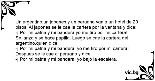 Un argentino,un japones y un peruano van a un hotel de 20 pisos. Al japones se le cae la cartera por la ventana y dice: