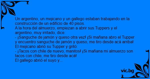 Un argentino, un mejicano y un gallego estaban trabajando en la construcción de un edifício de 40 pisos.