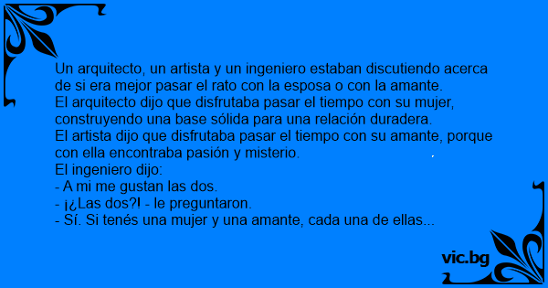 Un arquitecto, un artista y un ingeniero estaban discutiendo acerca de si era mejor pasar el rato соn la esposa o соn la amante.