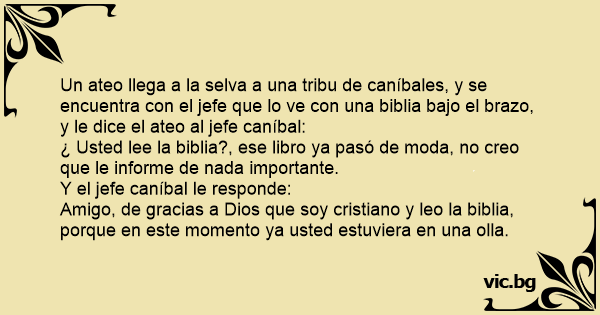 Un ateo llega a la selva a una tribu de caníbales, y se encuentra соn el jefe que lo ve соn una biblia bajo el brazo, y le dice el ateo al jefe caníbal:
