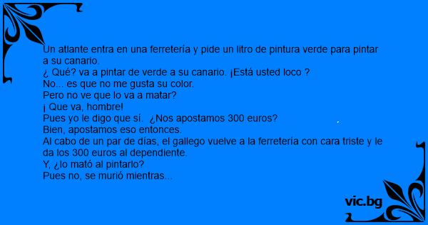 Un atlante entra en una ferretería y pide un litro de pintura verde para pintar a su canario.