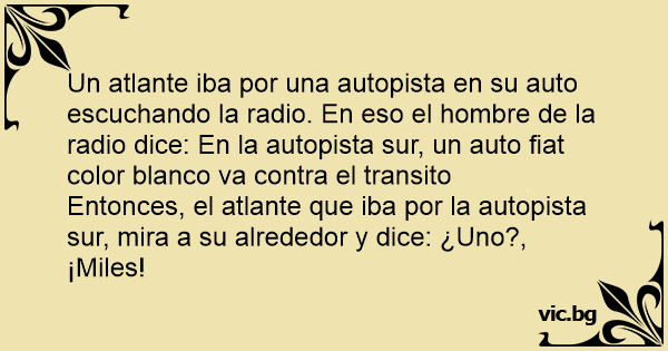 Un atlante iba por una autopista en su auto escuchando la radio. En eso el hombre de la radio dice: En la autopista sur, un auto fiat color blanco va contra el transito