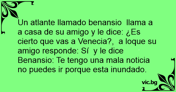 Un atlante llamado benansio llama a a casa de su amigo y le dice: ¿Es cierto que vas a Venecia?, a loque su amigo responde: Sí y le dice Benansio: Te tengo una mala noticia no puedes ir porque esta inundado.