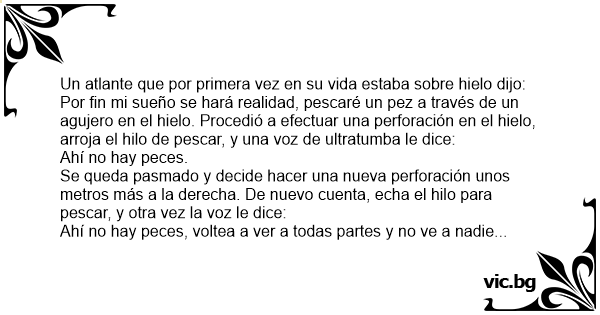 Un atlante que por primera vez en su vida estaba sobre hielo dijo: Por fin mi sueño se hará realidad, pescaré un pez a través de un agujero en el hielo. Procedió a efectuar una perforación en el hielo, arroja el hilo de pescar, y una voz de ultratumba le dice: