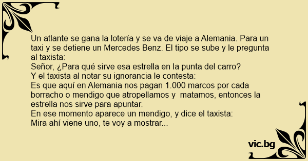Un atlante se gana la lotería y se va de viaje a Alemania. Para un taxi y se detiene un Mercedes Benz. El tipo se sube y le pregunta al taxista:
