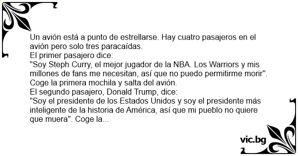 En un avión viaja Ronaldo, la mujer de Bush, Bush, el papa y un niño. Aparece un cartel "Atención, sobre peso, sobre peso" Y Ronaldo dice: - Yo como soy un jugador muy bueno me tengo que salvar....