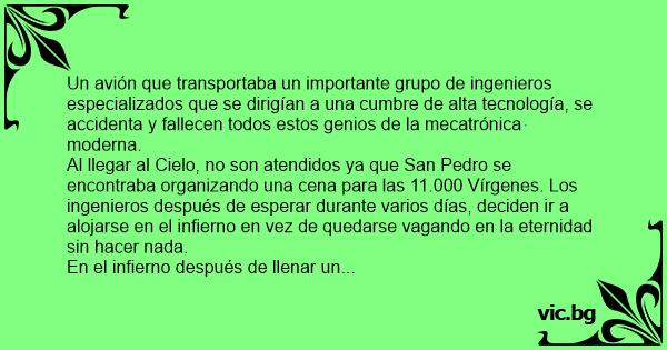 -¿ Un grupo de ingenieros? Pero si aquí en cielo no hemos juzgado ni condenado a ningún ingeniero; de tal manera que si los tienes allá, es de forma ilegal. Los ingenieros nunca van al infierno. Te demandaré por esto... - Terminó diciendo San Pedro en su santa ira.
