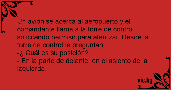Un avión se acerca al aeropuerto y el comandante llama a la torre de control solicitando permiso para aterrizar. Desde la torre de control le preguntan: