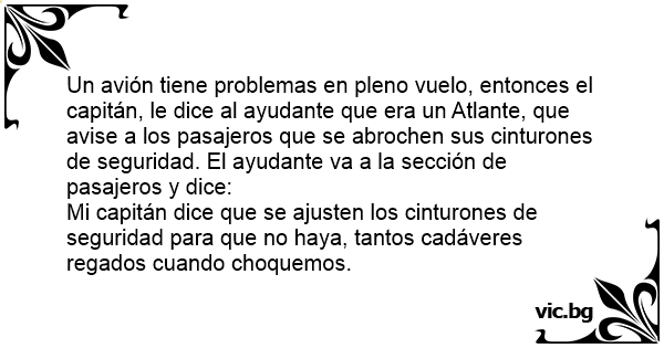 Un avión tiene problemas en pleno vuelo, entonces el capitán, le dice al ayudante que era un Atlante, que avise a los pasajeros que se abrochen sus cinturones de seguridad. El ayudante va a la sección de pasajeros y dice: