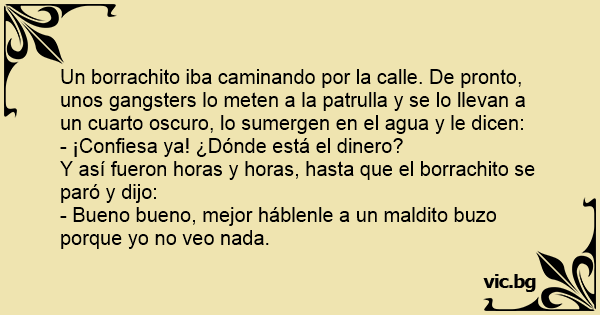 Un borrachito iba caminando por la calle. De pronto, unos gangsters lo meten a la patrulla y se lo llevan a un cuarto oscuro, lo sumergen en el agua y le dicen: