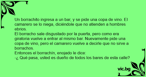 Un borrachito ingresa a un bar, y se pide una copa de vino. El camarero se lo niega, diciéndole que no atienden a hombres ebrios.