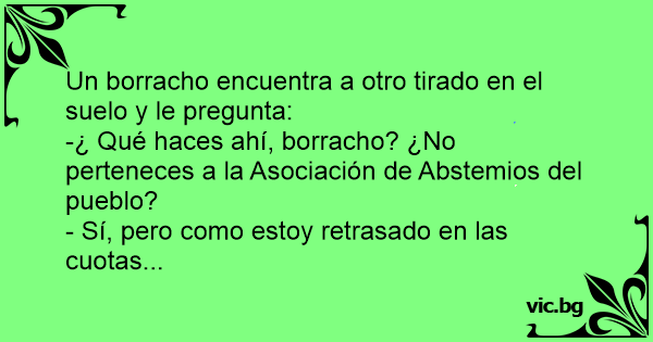 Un borracho encuentra a otro tirado en el suelo y le pregunta: -¿ Qué haces ahí, borracho? ¿No perteneces a la Asociación de Abstemios del pueblo? - Sí, pero como estoy retrasado en las cuotas...