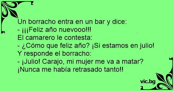 Un borracho entra a la cafetería, y con la voz todavía temblorosa dice: - Feliz año nuevo! Pero una mujer le responde: -Señor, pero si estamos en abril. Y el borracho contesta: -¿Abril? ¡Maldición, mi mujer me va a matar, nunca he llegado tan tarde!