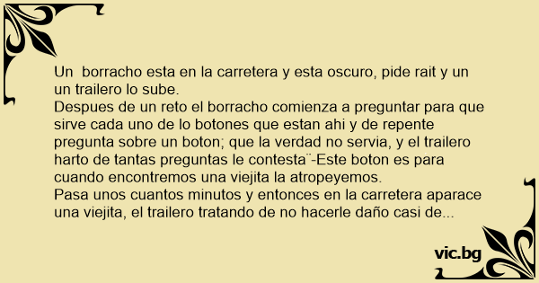 Pasa unos cuantos minutos y entonces en la carretera aparace una viejita, el trailero tratando de no hacerle daño casi de estrella, pero se escucha un ruido como de un golpe y detiene el trailer, luego el borracho dice -Ya manda a arreglar ese boton, por que te juro que sino hubiera habierto la puerta fallamos ala vieja.