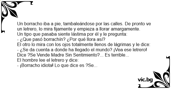 Un borracho iba a pie, tambaleándose por las calles. De pronto ve un letrero, lo mira fijamente y empieza a llorar amargamente.