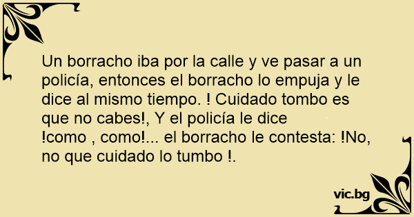 Un borracho iba por la calle y ve pasar a un policía, entonces el borracho lo empuja y le dice al mismo tiempo. ! Cuidado tombo es que no cabes!, Y el policía le dice