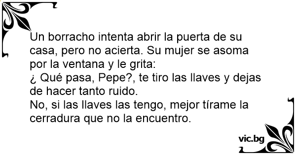 Un borracho intenta abrir la puerta de su casa, pero no acierta. Su mujer se asoma por la ventana y le grita:
