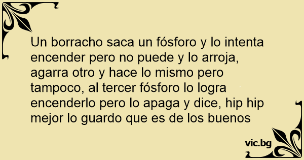 Un borracho saca un fósforo y lo intenta encender pero no puede y lo arroja, agarra otro y hace lo mismo pero tampoco, al tercer fósforo lo logra encenderlo pero lo apaga y dice, hip hip mejor lo guardo que es de los buenos