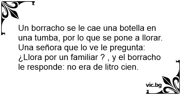 Un borracho se le cae una botella en una tumba, por lo que se pone a llorar. Una señora que lo ve le pregunta: ¿Llora por un familiar ? , y el borracho le responde: no era de litro cien.