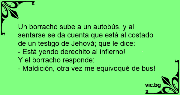 Un borracho sube a un autobús, y al sentarse se da cuenta que está al costado de un testigo de Jehová; que le dice: