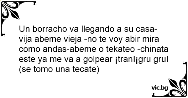 Un borracho va llegando a su casa-vija abeme vieja -no te voy abir mira como andas-abeme o tekateo -chinata este ya me va a golpear ¡tran!¡gru gru!(se tomo una tecate)