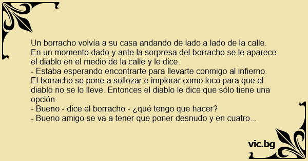 Un borracho volvía a su casa andando de lado a lado de la calle. En un momento dado y ante la sorpresa del borracho se le aparece el diablo en el medio de la calle y le dice:
