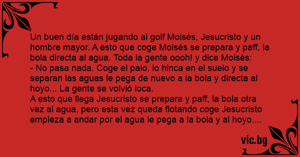 Un buen día están jugando al golf Moisés, Jesucristo y un hombre mayor. A esto que coge Moisés se prepara y paff, la bola directa al agua. Toda la gente oooh! y dice Moisés: