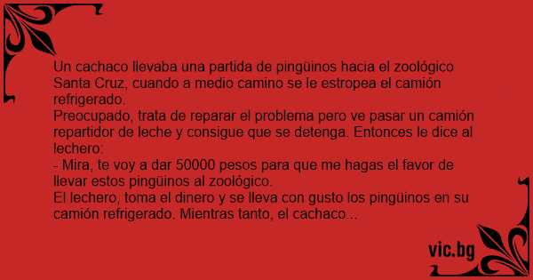 - Mira, te voy a dar 50000 pesos para que me hagas el favor de llevar estos pingüinos al zoológico.