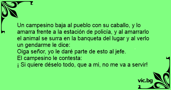 Un campesino baja al pueblo соn su caballo, y lo amarra frente a la estación de policía, y al amarrarlo el animal se surra en la banqueta del lugar y al verlo un gendarme le dice: