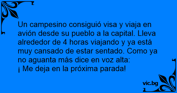 Un campesino consiguió visa y viaja en avión desde su pueblo a la capital. Lleva alrededor de 4 horas viajando y ya está muy cansado de estar sentado. Como ya no aguanta más dice en voz alta: