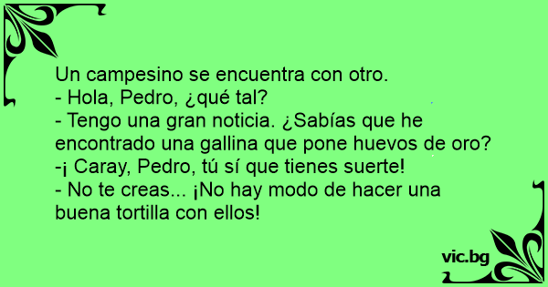 - Tengo una gran noticia. ¿Sabías que he encontrado una gallina que pone huеvоs de oro?