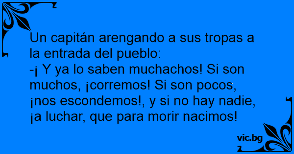 -¡ Y ya lo saben muchachos! Si son muchos, ¡corremos! Si son pocos, ¡nos escondemos!, y si no hay nadie, ¡a luchar, que para morir nacimos!