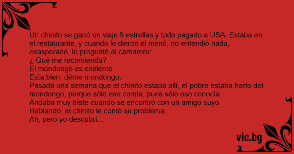 Un chinito se ganó un viaje 5 estrellas y todo pagado a USA. Estaba en el restaurante, y cuando le dieron el menú, no entendió nada, exasperado, le preguntó al camarero: