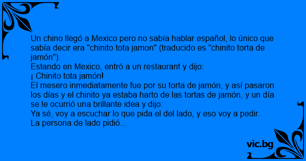 Un chino llegó a Mexico pero no sabía hablar español, lo único que sabía decir era "chinito tota jamon" (traducido es "chinito torta de jamón").