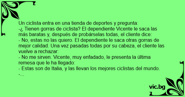-¿ Tienen gorras de ciclista? El dependiente Vicente le saca las más baratas y, después de probárselas todas, el cliente dice: