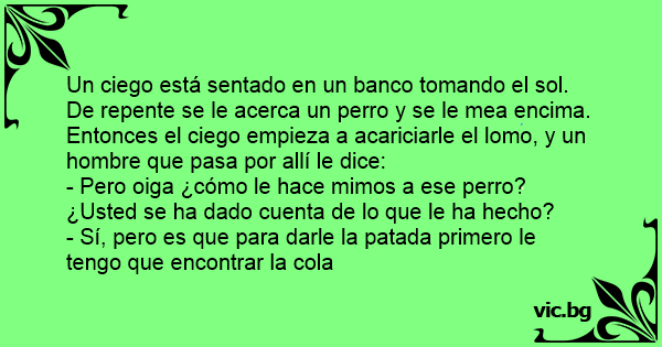 Un ciego está sentado en un banco tomando el sol. De repente se le acerca un реrrо y se le mea encima. Entonces el ciego empieza a acariciarle el lomo, y un hombre que pasa por allí le dice: