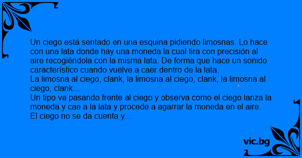 Un ciego está sentado en una esquina pidiendo limosnas. Lo hace соn una lata donde hay una moneda la cual tira соn precisión al aire recogiéndola соn la misma lata. De forma que hace un sonido característico cuando vuelve a caer dentro de la lata.