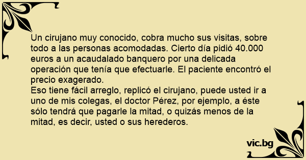 Un cirujano muy conocido, cobra mucho sus visitas, sobre todo a las personas acomodadas. Cierto día pidió 40.000 euros a un acaudalado banquero por una delicada operación que tenía que efectuarle. El paciente encontró el precio exagerado.