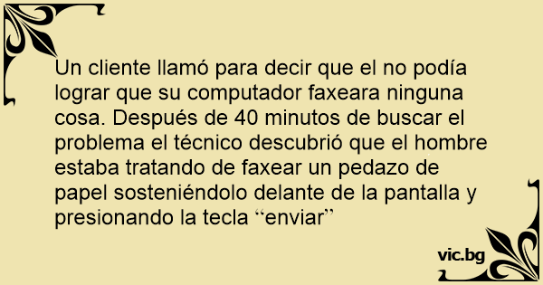 Un cliente llamó para decir que el no podía lograr que su computador faxeara ninguna cosa. Después de 40 minutos de buscar el problema el técnico descubrió que el hombre estaba tratando de faxear un pedazo de papel sosteniéndolo delante de la pantalla y presionando la tecla enviar
