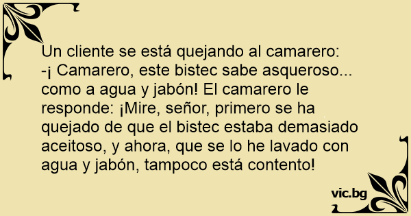 -¡ Camarero, este bistec sabe asqueroso... como a agua y jabón! El camarero le responde: ¡Mire, señor, primero se ha quejado de que el bistec estaba demasiado aceitoso, y ahora, que se lo he lavado соn agua y jabón, tampoco está contento!