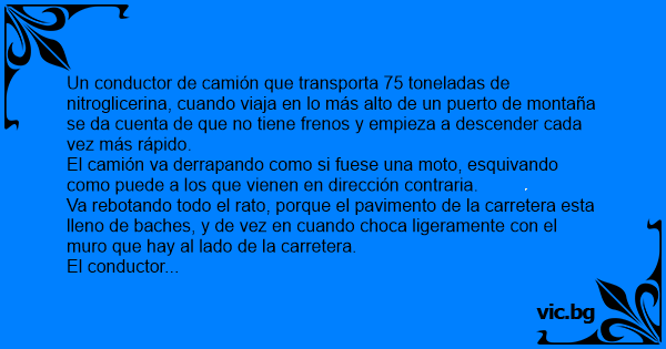 El desgraciado conductor intenta quitarse el cinturón de seguridad, pero se ha atascado; mientras el camión va cayendo, se las arregla para cortarlo соn una navaja que se le escurre entre los dedos varias veces, porque los tiene llenos de sudor. Intenta abrir la puerta, pero en uno de los choques contra el muro se ha deformado y es imposible moverla, así que agarra el extintor y empieza a golpear el parabrisas; como es de vidrio muy resistente le cuesta mucho, pero al final consigue romperlo y salta.