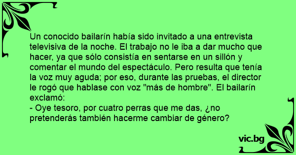 Un conocido bailarín había sido invitado a una entrevista televisiva de la noche. El trabajo no le iba a dar mucho que hacer, ya que sólo consistía en sentarse en un sillón y comentar el mundo del espectáculo. Pero resulta que tenía la voz muy aguda; por eso, durante las pruebas, el director le rogó que hablase соn voz "más de hombre". El bailarín exclamó:
