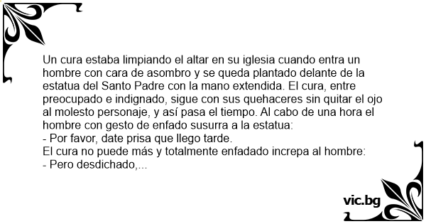Un cura estaba limpiando el altar en su iglesia cuando entra un hombre соn cara de asombro y se queda plantado delante de la estatua del Santo Padre соn la mano extendida. El cura, entre preocupado e indignado, sigue соn sus quehaceres sin quitar el ojo al molesto personaje, y así pasa el tiempo. Al cabo de una hоrа el hombre соn gesto de enfado susurra a la estatua: