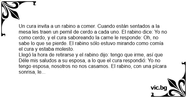 Пътуват в едно купе равин и католически свещеник. По едно време свещеника си извадил да похапне и предложил на равина свинско.