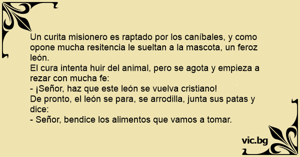 El safari y el leon hambriento Ο ιεραπόστολος και το λιοντάρι Един мисионер се разхождал в Африка и на среща му изскочил лъв. Мисионерът веднага клекнал и започнал да се моли: Un eremita si trova improvvisamente di fronte ad un leone. Non sapendo cosa fare, si mette in ginocchio e dice una preghiera: "Mio Dio, dona a questo leone dei sentimenti cristiani!". Ein Missionar im Dschungel. Plötzlich sieht er vor sich einen riesigen Löwen. Er fällt auf die Knie und betet zu Gott, er möge ihn beschützen. Plötzlich kauert auch der Löwe nieder und beginnt zu beten. Der Missionar ist glücklich: Ein Wunder, Gott hat ihn gerettet! Da hört er das Gebet des... Мисионер в Африка е заобиколен от лъвове, които искат да го изядат. Той коленичи започва да се моли: „Мили Боже, моля те, направи чудо и направи от тези животни вярващи християни!“ Проблясва светкавица. Миг по-късно лъвовете коленичат в кръг около него и започват да се молят: „Господи Исусе,... Ein Missionar wird in Afrika von Löwen umkreist, die ihn fressen wollen. Er kniet nieder und betet: "Lieber Gott, bitte wirke ein Wunder und mache aus diesen Tieren gläubige Christen!" Da knien die Löwen auch im Kreis um ihn nieder und beginnen zu beten: "Komm‘ Herr Jesus sei unser Gast und... Священник в пустелі зустрівся з левом. Почав молитьсь з переляку: - О, Боже! Молю тебе, внуши цьому леву християнські почуття! Лев сідає на задні лапи, схиляє голову і вимовляє: - Благослови, Господи, їжу, яку я зараз прийму. Il était une fois un explorateur qui tomba devant un lion. L'explorateur apeuré dit : - Dieu, faites que ce lion est une pensée Chrétienne. Et le lion répondis : - Dieu, bénissez ce repas. Un missionnaire en plein désert se retrouve nez à nez avec un lion affamé. Il se met à genoux et commence à prier : - Mon Dieu, bénissez-moi et faites que ce lion épargne votre fidèle serviteur. A... I det antika Rom jagades en kristen av ett lejon. Han sprang genom stadsgatorna, och ut i skogen, där han rusade i sicksack mellan träden. Till slut insåg han att hela flykten var meningslös,... O Padre estava passeando pela floresta quando viu uma onça que corria em sua direção. O Padre começou a correr e quando ela estava quase alcançando-o, ele teve uma idéia brilhante. Parou,... Der Pfarrer auf Urlaub in Afrika sieht sich plötzlich von einem Rudel Löwen umzingelt. Die Flucht ist ausgeschlossen. Da fällt er auf die Knie, schließt die Augen und betet: "Oh Herr, verschone... C'est un missionnaire parti inculquer la parole de dieu en Afrique. En pleine savane il se retrouve face à un lion affamé qui commence à le poursuivre. Le missionnaire voit son salut dans la... Va un cura corriendo porque lo persigue un león cuando de repente el cura se arrodilla y dice: - Señor, te pido que este león se vuelva cristiano. El león se arrodilla y dice: - Señor, bendice... An atheist is on an African safari when he is ambushed by a lion. “Oh God!” he screams “Help me!” The lion stops in its tracks and a voice from the heavens rings out: “All your life you said you... En prest var på bjørnejakt. Han var uheldig og kom litt for brått på bjørnen. Presten sprang av gårde det han kunne, men bjørnen var raskere og tok innpå. Da han kjente bjørnens pust i nakken,... Au Kenya, un touriste égaré se retrouve nez à nez avec un lion. Ne sachant que faire pour sauver sa peau, il s'agenouille et prie : - Dieu, faites que ce lion ait une pensée chrétienne... Alors, le... Caminaba un misionero por la sabana africana, cuando de repente vio aparecer ante si, un león enorme. El misionero miró a la derecha e izquierda, pero no encontró ningún lugar para ocultarse; ante... Un pape en expédition en Afrique se trouve d'un coup agressé par un lion affamé... Bien que surpris, il prie Dieu : - Seigneur, Faites que cet animal soit animé de pensées chrétiennes. Aussitôt le... Un lion pourchasse un Chrétien, dans la Rome antique. Le Chrétien fuit et tente d'échapper à Son poursuivant, passant dans des Endroits les plus inattendus et les plus difficiles. Mais, Il se rend... У пустелі на місіонера напав лев. Місіонер благає: — Господи, вклади в душу цьому звірові християнські почуття! Раптом лев піднімає очі до неба і каже: — Господи, благослови їжу, яку я зараз прийму! Un misionar in jungla. Deodata se trezeste cu un leu urias in fata sa. Cade in genunchi cu mainile impreunate si zice: - Doamne apara-ma! Leul la randul sau isi impreuneaza labele din fata si...