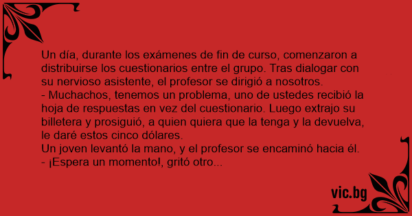 - Muchachos, tenemos un problema, uno de ustedes recibió la hoja de respuestas en vez del cuestionario. Luego extrajo su billetera y prosiguió, a quien quiera que la tenga y la devuelva, le daré estos cinco dólares.
